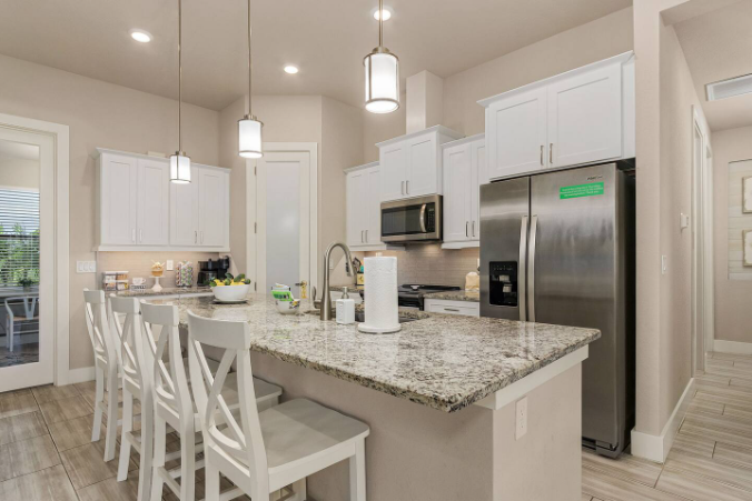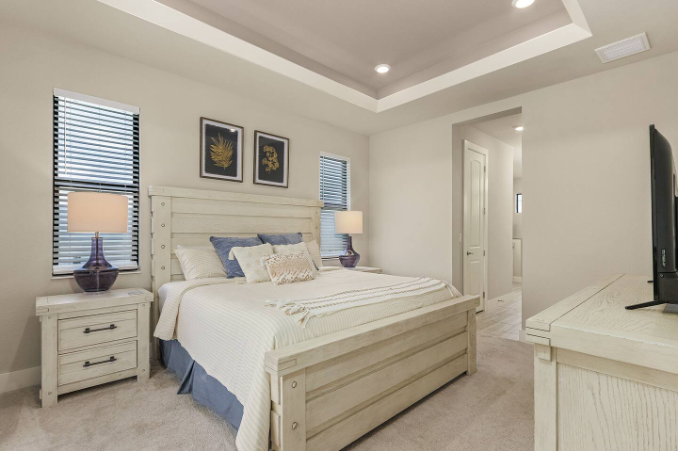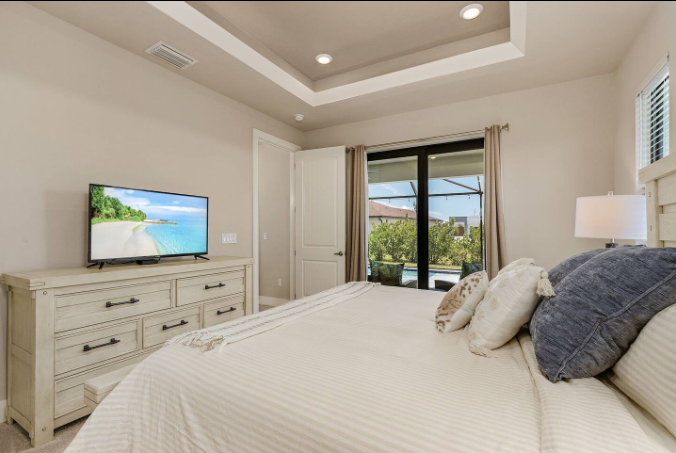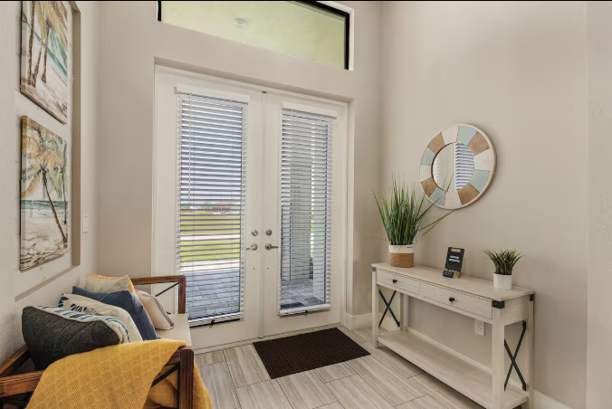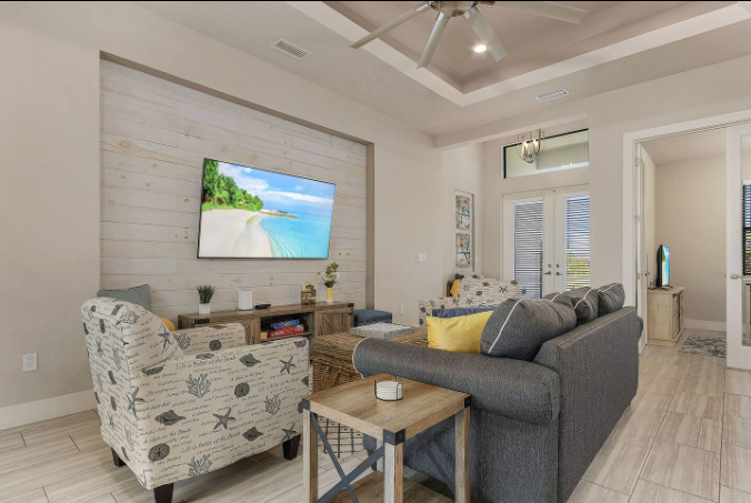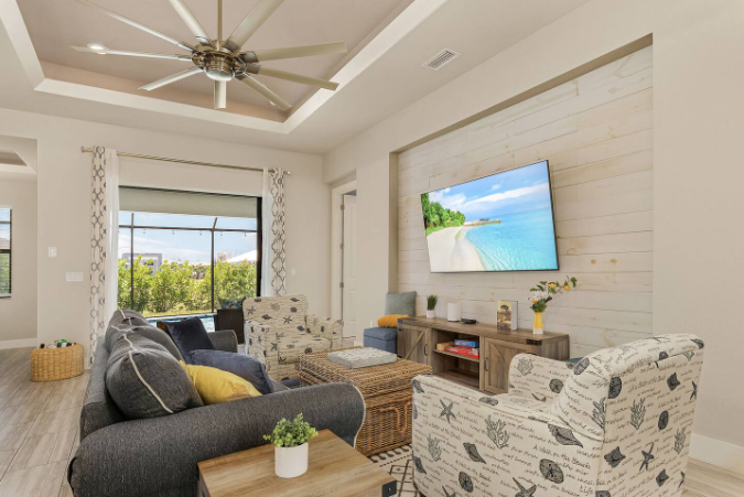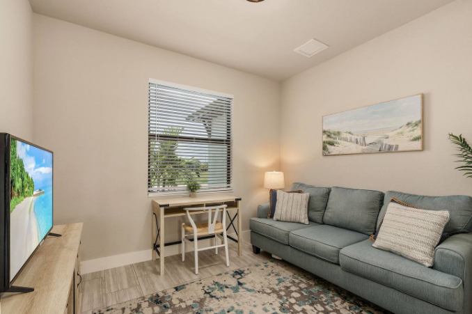 Vaulted ceilings and big windows fill the great room with Florida sunshine. Lounge on the plush sofa, stream your favorite shows on the smart TV, or slide open the doors to head outside.