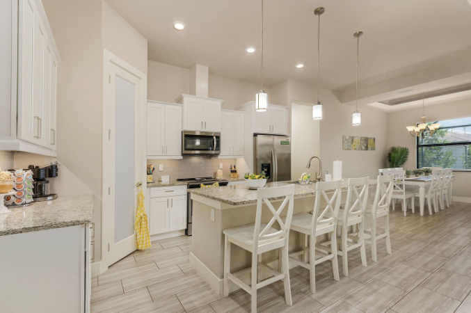 The modern kitchen is fully stocked for effortless meals β complete with high-end appliances, cooking basics, and a coffee & tea bar to start every morning right.