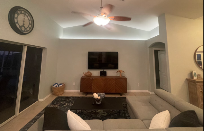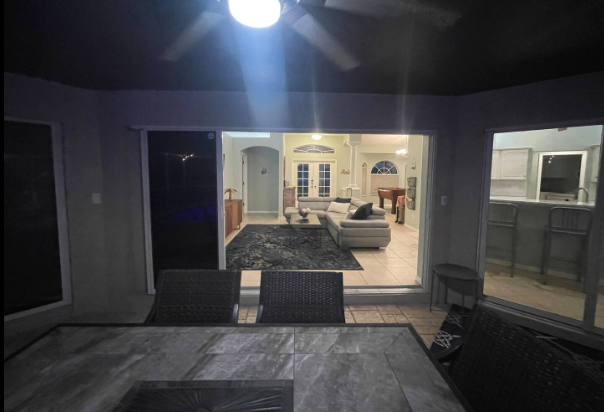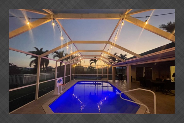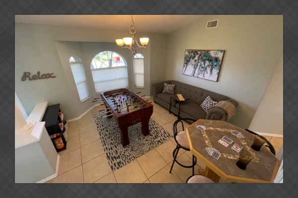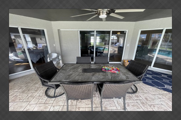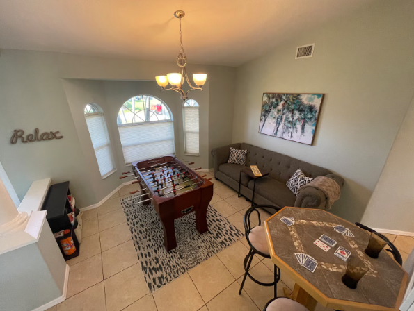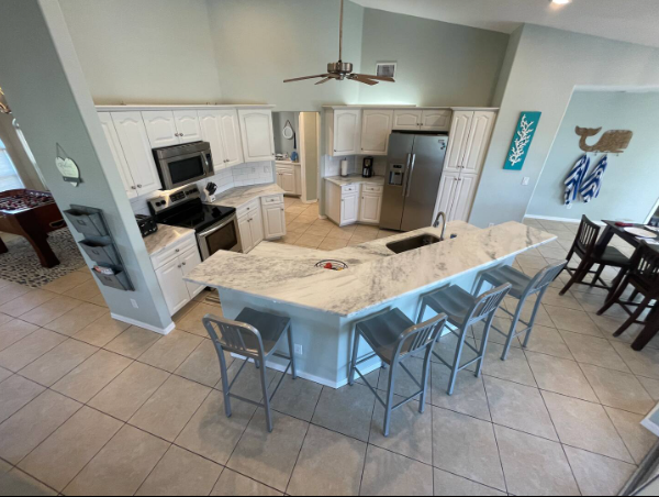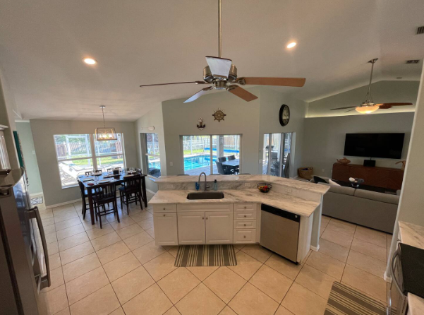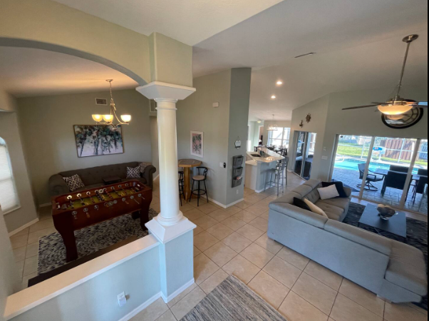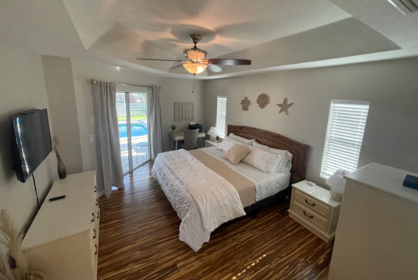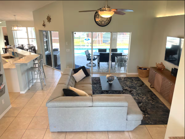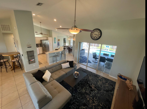 The outdoor living space, the great location, the open layout, and the 4 bedrooms are the primary reasons we fell in love with this home. The outdoor area is what really separates this place from almost all others. The large screened in outdoor living space is like being at a mini-resort. This area features a beautiful heated pool, sun deck, sun loungers, outdoor dining set, as well as a grill and mini fridge. We have an assortment of pool toys, pool noodles, children’s life jackets, as well as swim goggles. The pool has a shallow end with stairs leading in, and a ledge at the deeper end to make climbing in and out a breeze. Kids pool toys and life jackets are in the deck box and free to use. The pool lights cafe bulbs create an excellent ambience to entertain or relax in at night. The large covered lanai sports a large ceiling fan to keep you cool while you enjoy the outdoors.