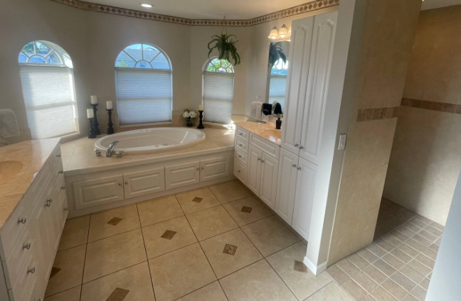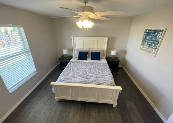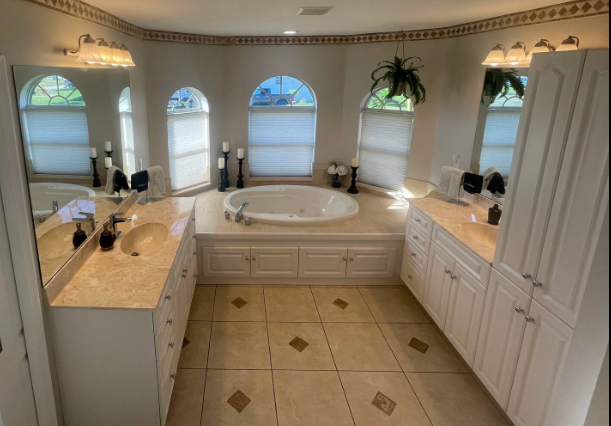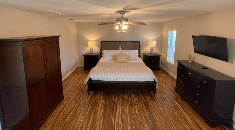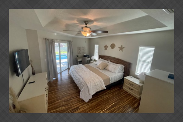 The large master suite provides comfort as a home away from home. Walk right out from your master bedroom through the large sliding glass doors to the beautiful pool area. The bamboo bedroom set includes a spacious king size bed, matching dressers and night stands, and a walk in closet. In addition, there is a private desk and printer, so bring your computer and work pool side with our free high speed wifi accessible throughout the home. The master bath includes a jetted tub, large walk in shower with dual shower heads, 2 separate sink area, as well as a private toilet room.