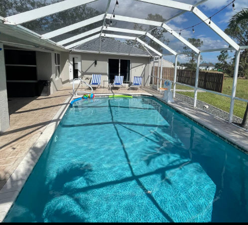 This home is located in a quiet neighborhood. This open concept home has 4 large bedrooms, 2 bathrooms, large pool, patio, grassy yard for games, 2 car garage, laundry, fully stocked kitchen, as well a everything you need to relax and enjoy southwest Florida.