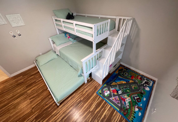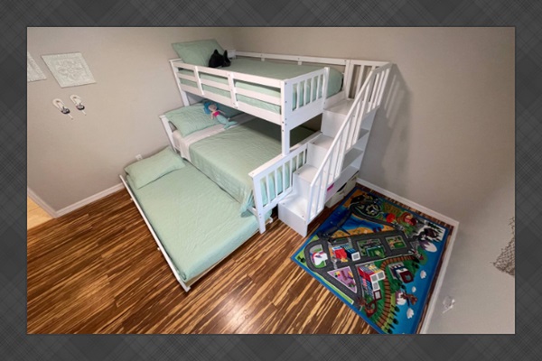 The fourth bedroom is a perfect play room for the kids. The large bunk bed has a twin bed over a full bed with a twin sized trundle bed below, and stairs to make a safe trip up and down from the top bunk.