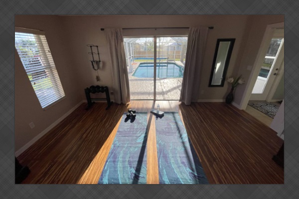The second spacious king bedroom includes a television, dressers and armoire. Enjoy a workout with free weights and yoga mats while you overlook the pool though another one of the homes large sliding glass doors.