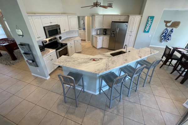 The 2400 square foot interior layout is very open, airy, and practical with vaulted ceilings and loads of natural light. The open concept layout includes a large family room, dining room, and game room that center around the kitchen. Enjoy time cooking in the large spacious kitchen that overlooks the entire pool area. Both King bedrooms have sliding glass doors that overlook the pool area.